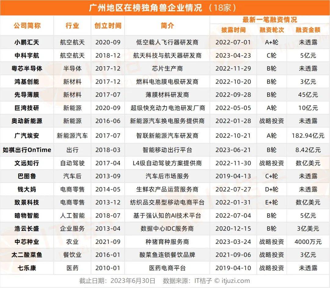 从行业来看,这18家独角兽中有一半集中在半导体(粤芯半导体)、新能源(巨湾技研、奥动新能源、广汽埃安)、新材料(鸿基创能、先导薄膜)、航天(小鹏汇天、中科宇航)等目前大热的硬科技赛道。
