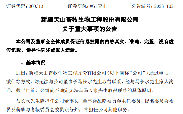 同日,*ST天山发布公告,近日,公司通过电话、微信等方式,均无法与公司董事长马长水取得联系,经与马长水家人沟通,截至目前,公司尚不确定无法与马长水取得联系的具体原因。