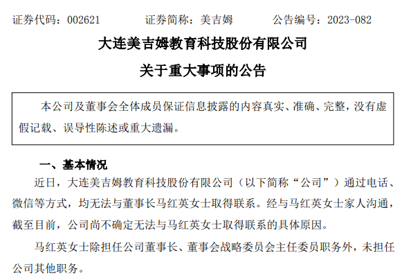 11月29日,美吉姆夜间发布公告,近日,公司通过电话、微信等方式,均无法与董事长马红英取得联系。经与马红英家人沟通,截至目前,公司尚不确定无法与马红英取得联系的具体原因。