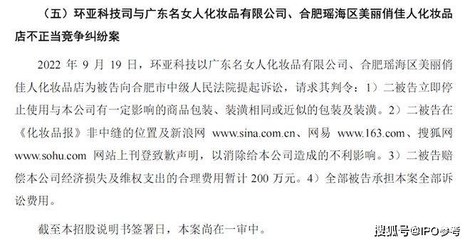 IPO时,环亚科技及其子公司尚未了结的或虽然发生在报告期外但仍对公司产生较大影响以及可预见的涉案金额在100万元以上的诉讼、仲裁案件11起,涵盖合同纠纷案4起、侵害商标及不正当竞争纠纷案7起,均系环亚科技作为原告提起。