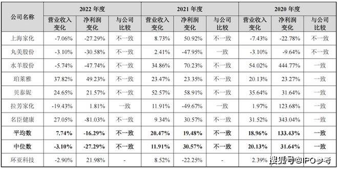 需要关注的是,环亚科技2021年、2022年两年的业绩变化情况与大多数同行业上市公司业绩变化相悖。2021年,上海家化、水羊股份、珀莱雅、贝泰妮、名臣健康的营业收入和净利润均同比上涨,仅丸美股份和拉芳家化出现收入上升净利润同比下降的情况。