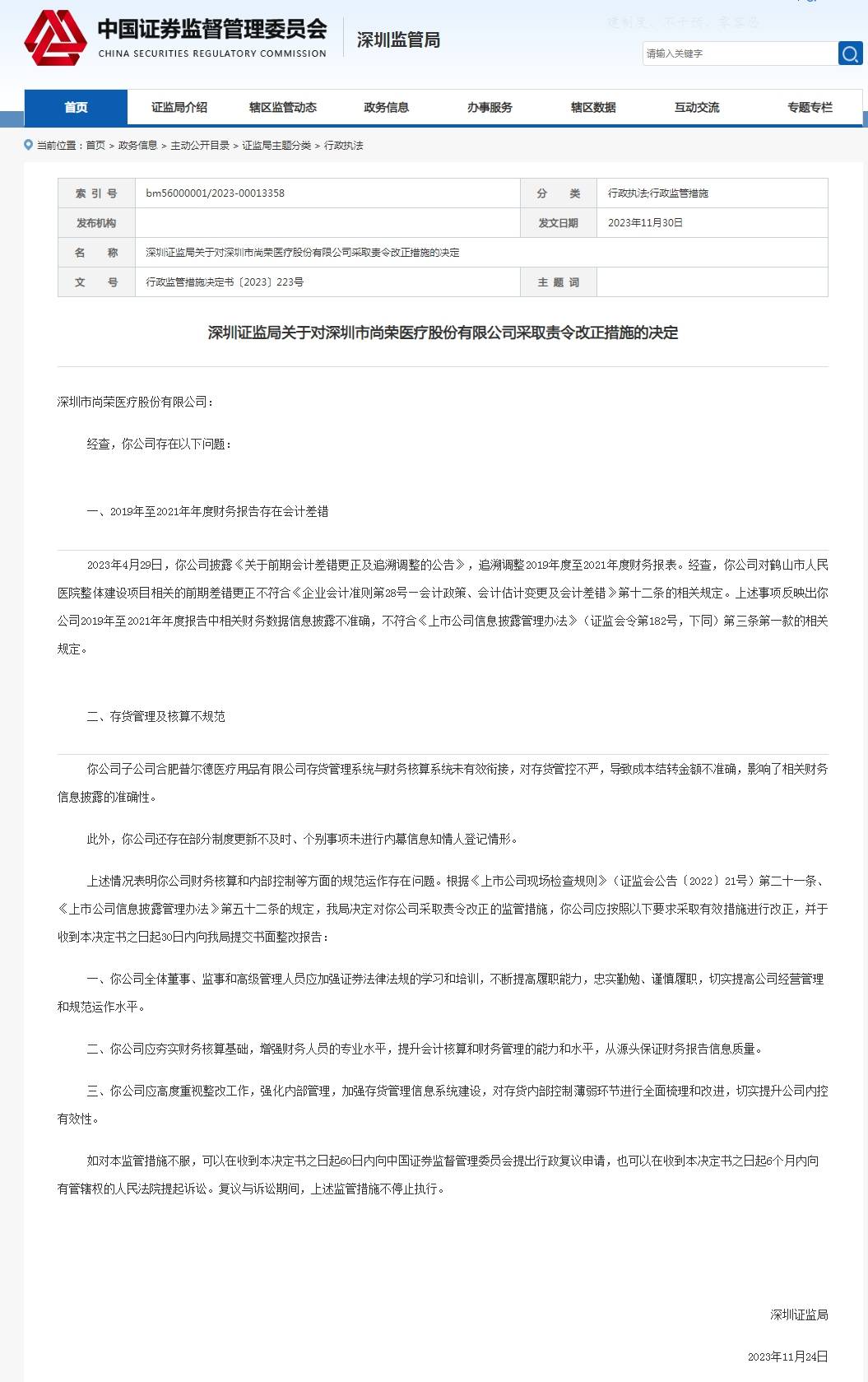 中新经纬11月30日电 深圳证监局网站30日公布两则监管措施信息,深圳市尚荣医疗股份有限公司(下称尚荣医疗)被责令改正,公司董事长及财务负责人被警示。