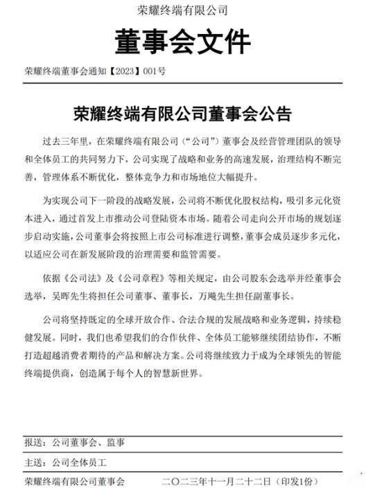 据悉,吴晖此前为深圳市水务集团有限公司董事长。11月23日,媒体报道称,荣耀内部文件显示,为实现公司下一阶段的战略发展,公司将不断优化股权结构,吸引多元化资本进入,通过首发上市推动公司登陆资本市场。随着公司走向公开市场的规划逐步启动实施,公司董事会将按照上市公司标准进行调整,董事会成员逐步多元化,以适应公司在新发展阶段的治理需要和监管需要。依据《公司法》及《公司章程》等相关规定,由公司股东会选举并经董事会选举,吴晖先生将担任公司董事、董事长,万飚先生担任副董事长。
