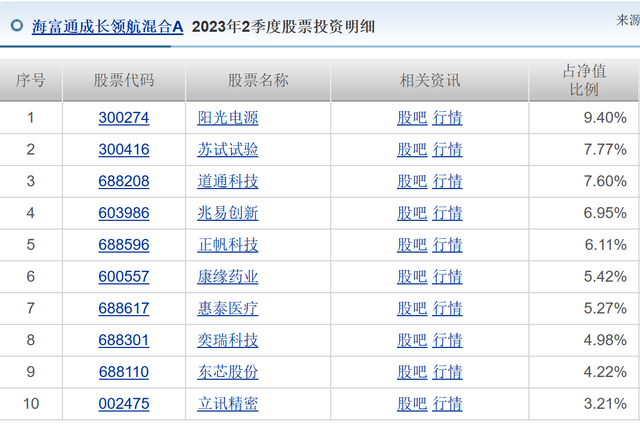 排除掉细分赛道碳中和主题基金,以海富通成长领航混合为例,2023年2季度,该基金前十大重仓股包括:阳光电源、道通科技、康缘药业、惠泰医疗等。