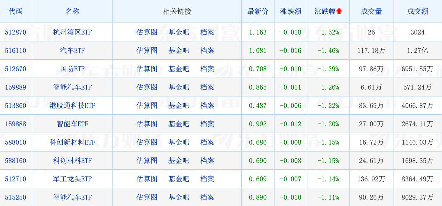 下跌方面,汽车产业链个股展开调整,皖通科技跌停。汽车ETF领跌,最高下跌1.46%。