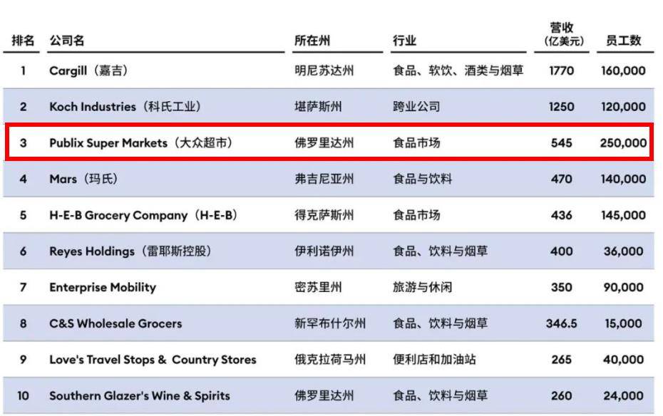 大众超级市场(Publix Super Markets)在其中显得有些“另类”,这家企业坚决不上市,是全美第三大私营公司、最大的私人超市,去年实现营收545.3亿美元(约合人民币3880亿元),同比增长13.6%。
