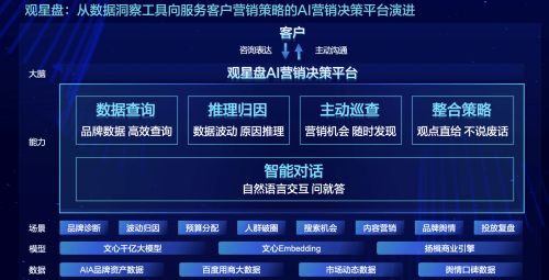 除了科学方法论的指导,成功的营销离不开精细化的洞察和严谨的策略指导。观星盘以文心千亿大模型、文心Embedding、扬楫商业引擎等模型和百度用商大数据、AIA品牌资产数据等数据为底座,重构了产品新框架,成为可无损传达营销方法论,一“问”即达的AI营销决策平台。