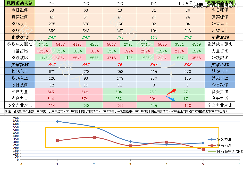 1、整体数据分析:跌3%个股370家,涨3%个股213家,实体涨停24家,当天跌停1家,做多力道279,做空力道171。