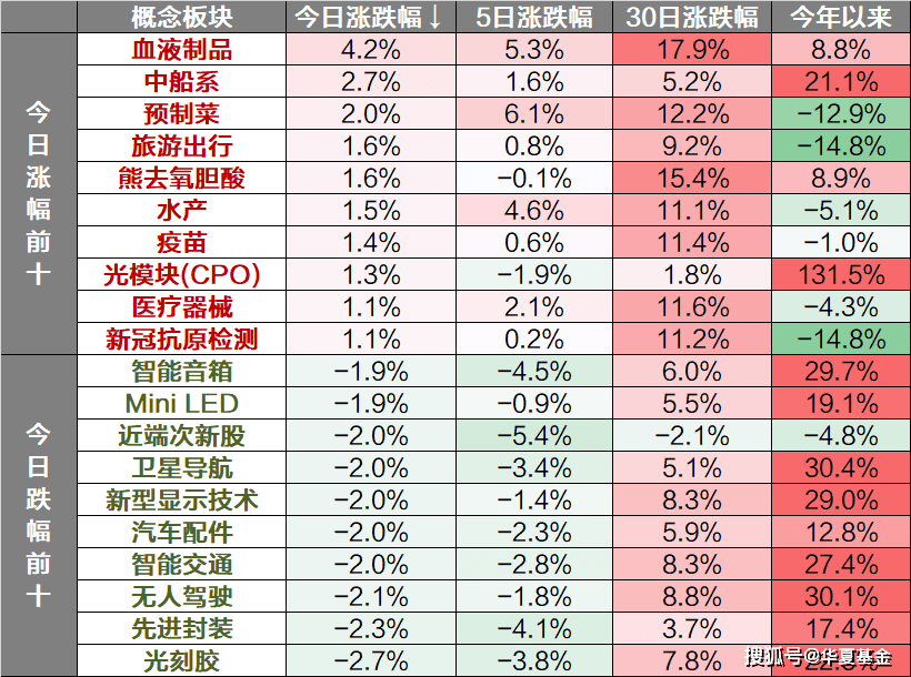 概念主题方面,血液制品、中船系、预制菜等板块上涨,光刻胶、先进封装、无人驾驶等板块下跌。