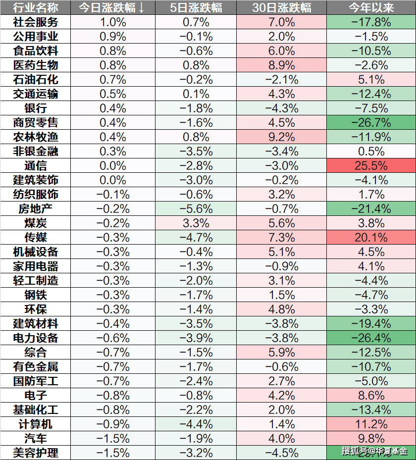 行业上来看,社会服务、公用事业、食品饮料等板块领涨,美容护理、汽车、计算机等板块下跌。