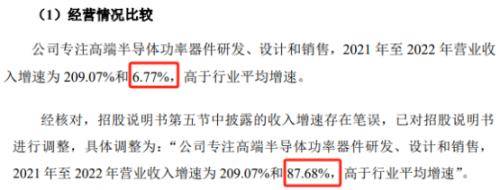 三是,既然把“比特币”删了,为何不顺手把收入增速存在的笔误也改掉呢?尚阳通首份申报稿显示,“公司专注高端半导体功率器件研发、设计和销售,2021年至2022年营业收入增速为209.07%和6.77%,高于行业平均增速。”根据回复函可知,其中“6.77%”为笔误,实际为“87.68%”。