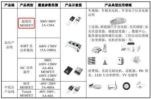 尚阳通的产品线主要分为高压产品线和中低压产品线。高压产品线的主要产品包括,超级结MOSFET、IGBT及功率模块、SiC功率器件等。其中超级结MOSFET为尚阳通最主要产品,应用于新能源汽车充电桩、汽车电子、数据中心、服务器和通信电源、LED大功率照明、TV电源等产品。