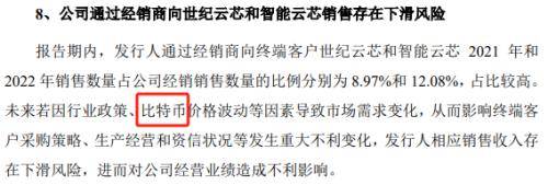 观察者网曾于今年6月发布《尚阳通IPO:客户涉及“比特币”,部分股东或属突击入股》一文。彼时尚阳通的申报稿中,有一些吸引眼球,比如谈及“比特币”。申报稿显示,“报告期内,发行人通过经销商向终端客户世纪云芯和智能云芯2021年和2022年销售数量占公司经销销售数量的比例分别为8.97%和12.08%,占比较高。未来若因行业政策、比特币价格波动等因素导致市场需求变化,从而影响终端客户采购策略、生产经营和资信状况等发生重大不利变化,发行人相应销售收入存在下滑风险,进而对公司经营业绩造成不利影响。”