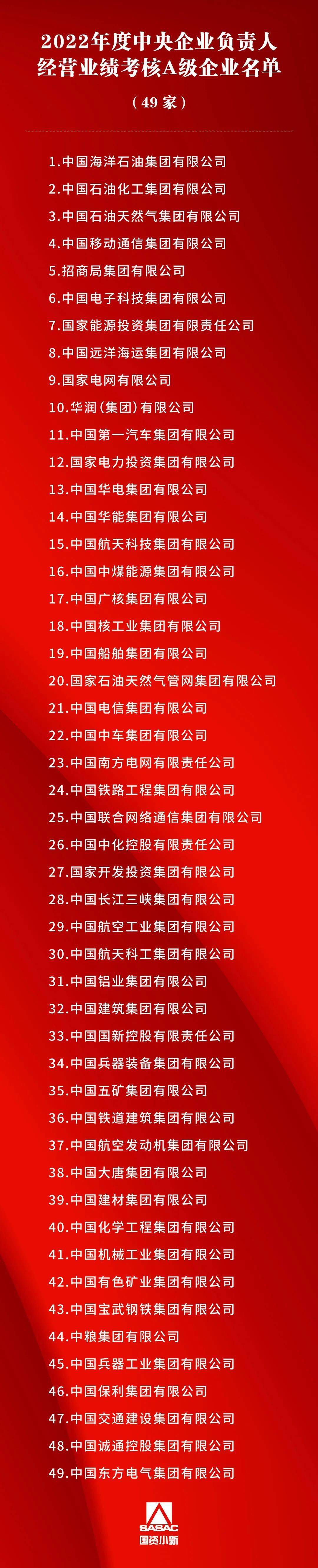 根据《中央企业负责人经营业绩考核办法》,2022年度中央企业负责人经营业绩考核结果已经国务院国资委党委会议、委务会议审议通过。A级企业名单如下:
