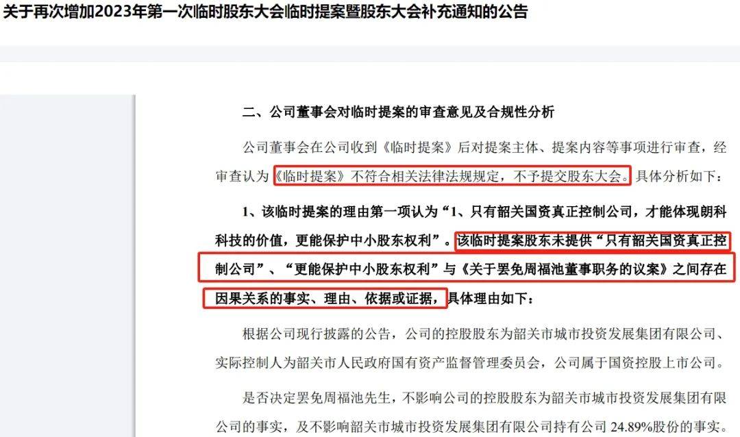 据《每日经济新闻》援引知情人士的消息,在朱平波递交提案之前,韶关城投于11月15日提交了《关于罢免周福池董事职务的议案》的函,但因朗科科技公司章程中有“不得无故罢免董事”的规定,监管部门要求做出审慎考虑,韶关城投便撤回了议案。
