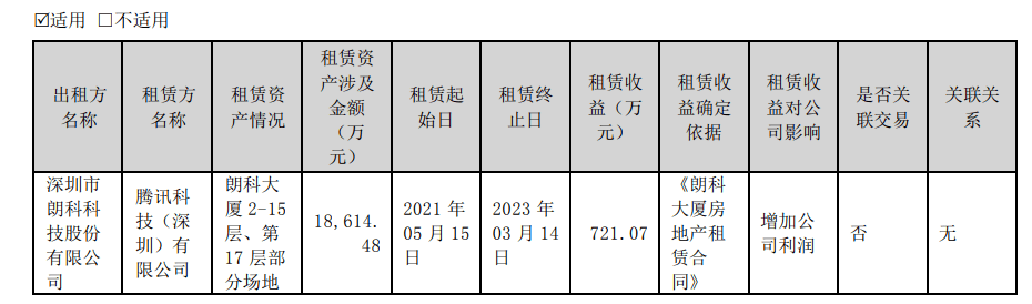 今年年初,朗科科技曾发布公告称,腾讯公司因受经济下行压力加剧、消费增长放缓等因素影响,拟提前退租。其2023半年报显示,报告期内,来源于腾讯的租赁收入约为 757.12 万元(含税),租赁终止日为3月14日。而2021年,来自腾讯公司的租金收入有3607万元。