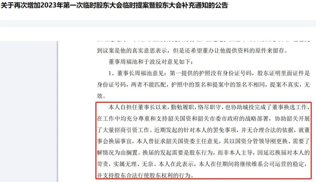 而周福池则表示,就董事会换届事宜,曾征求韶关国资委主任意见,其以国资分管领导刚更换、需要了解情况为由搁置。换届的发起需要是股东行为,而非其本人主导。