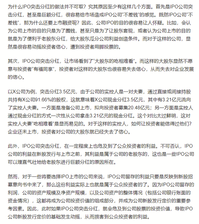 香颂资本董事沈萌也表示,企业上市前分红并没有违法、违规,特别是上市预期融资会补充企业运营的资本,所以将留存的未分配利润进行分配并不会产生更多风险,虽然很容易引发新投资者的反弹,但这种分红也是对原投资者的一种回馈,毕竟原投资者陪伴和支持企业所承担的风险远比新投资者更大。