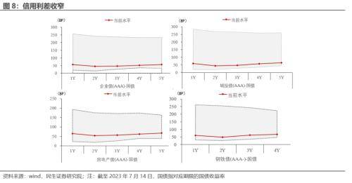 信用利差本周走窄。2年期企业债与国债利差为44.85BP,相比上周下降5.2BP;2年期城投与国债利差为44.39BP,相比上周下降5BP;2年期AAA地产债与国债利差为54.54BP,相比上周下降2.1BP;2年期AAA-钢铁债与国债利差为49.3BP,相比上周下降3.2BP。