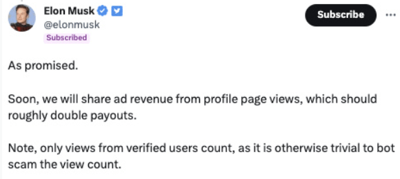 7月16日,马斯克在推特发文称,推特将“很快”分享来自个人资料页面浏览量的广告收入,这将使支出翻倍。马斯克提醒,只有来自认证用户的浏览次数才会被计算在内。