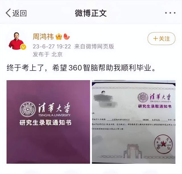 就在上个月底,离婚不久的360董事长周鸿祎,还晒出了自己的清华大学博士录取通知书。