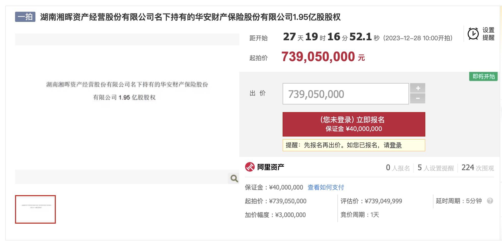 湘晖资产名下持有的华安保险1.95亿股股权,在阿里司法拍卖平台挂牌,将由湖南省长沙市中级人民法院在2023年12月28日进行公开拍卖。