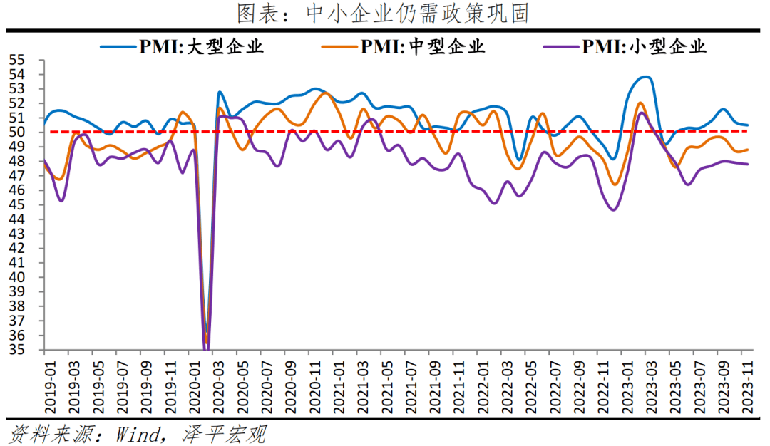 11月大、中、小型企业PMI分别为50.5%、48.8%和47.8%,比上月变动-0.2、0.1和0.1个百分点。需求不足,中小型企业复苏不稳固,仍需政策支持。