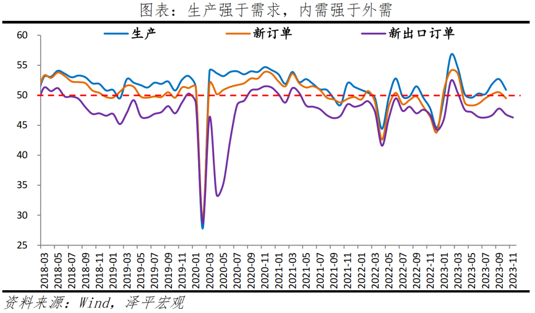 第一,11月生产指数和新订单指数分别为50.7%和49.4%,比10月回落0.2和0.1个百分点。从供给端看,金属制品、通用设备、铁路船舶航空航天设备等行业生产指数均高于55.0%;纺织、石油煤炭及其他燃料加工、化学纤维及橡胶塑料制品等行业均位于荣枯线下。从需求端看,医药、汽车、铁路船舶航空航天设备等行业新订单指数均高于53.0%。制造业企业中反映市场需求不足的企业占比超六成。
