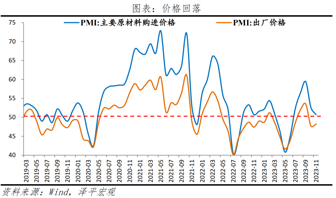 11月主要原材料购进价格指数和出厂价格指数分别为50.7%和48.2%,分别较上月变动-1.9和0.5个百分点,主因需求不足、国际大宗商品价格回落。出厂价格和原材料价格指数差值为2.5%,改善下游企业经营状况更多应从刺激需求着手。