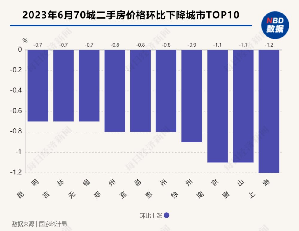 值得一提的是,楼市表现一直火热的上海,6月份的二手住宅价格环比跌幅竟然排在全国第一,达1.2%。