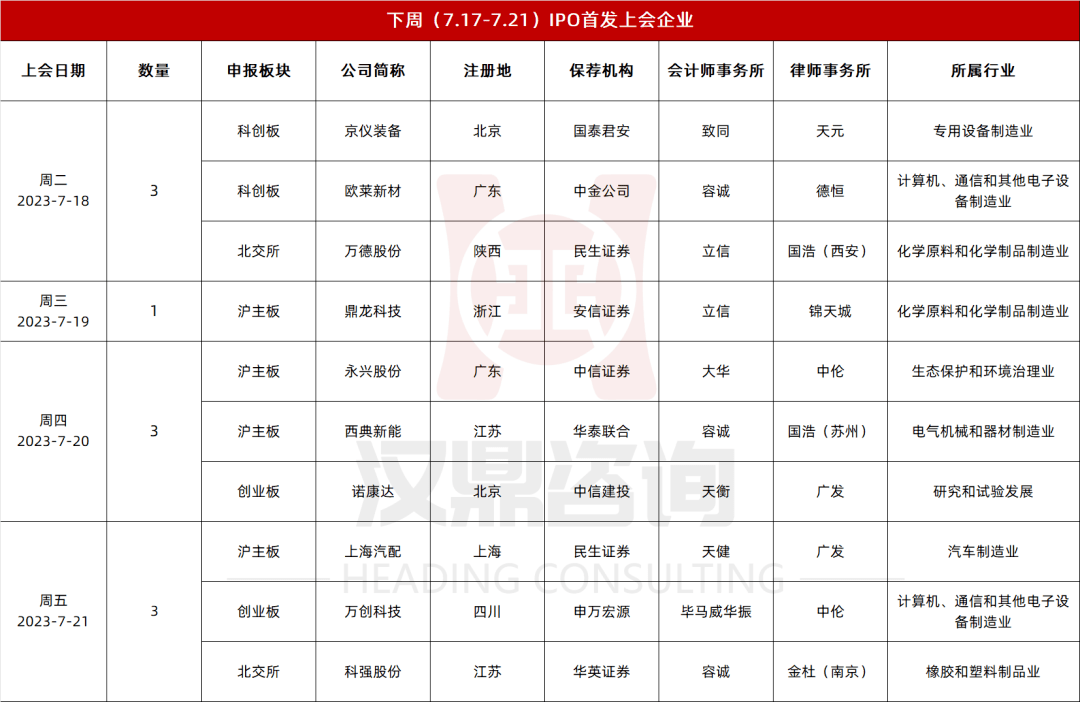 下周(7月17日-7月21日),IPO将审核10家。其中,沪主板4家,科创板2家,创业板2家,北交所2家。