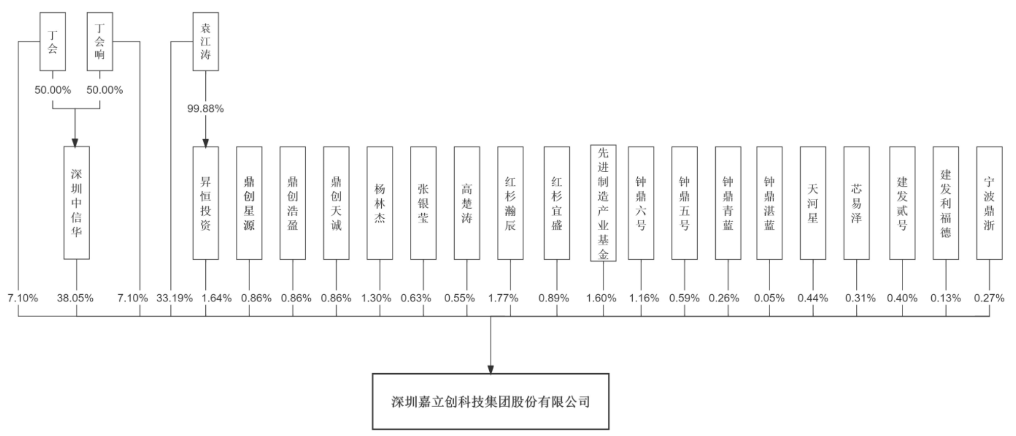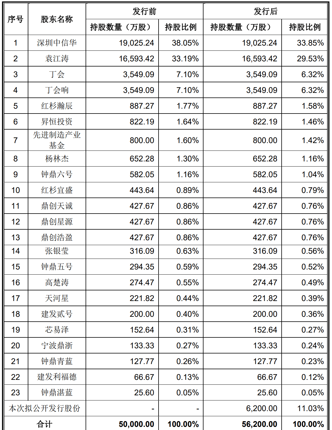IPO后,深圳中信华持股为33.85%,袁江涛直接持股为29.53%,丁会、丁会响直接分别持股为6.32%,红杉瀚辰持股为1.58%,昇恒投资持股为1.46%,先进制造产业基金持股为1.42%,杨林杰持股为1.16%,钟鼎六号持股为1.04%,红杉宜盛持股为0.79%,鼎创天诚、鼎创星源、鼎创浩盈分别持股为0.76%,张银莹持股为0.56%;