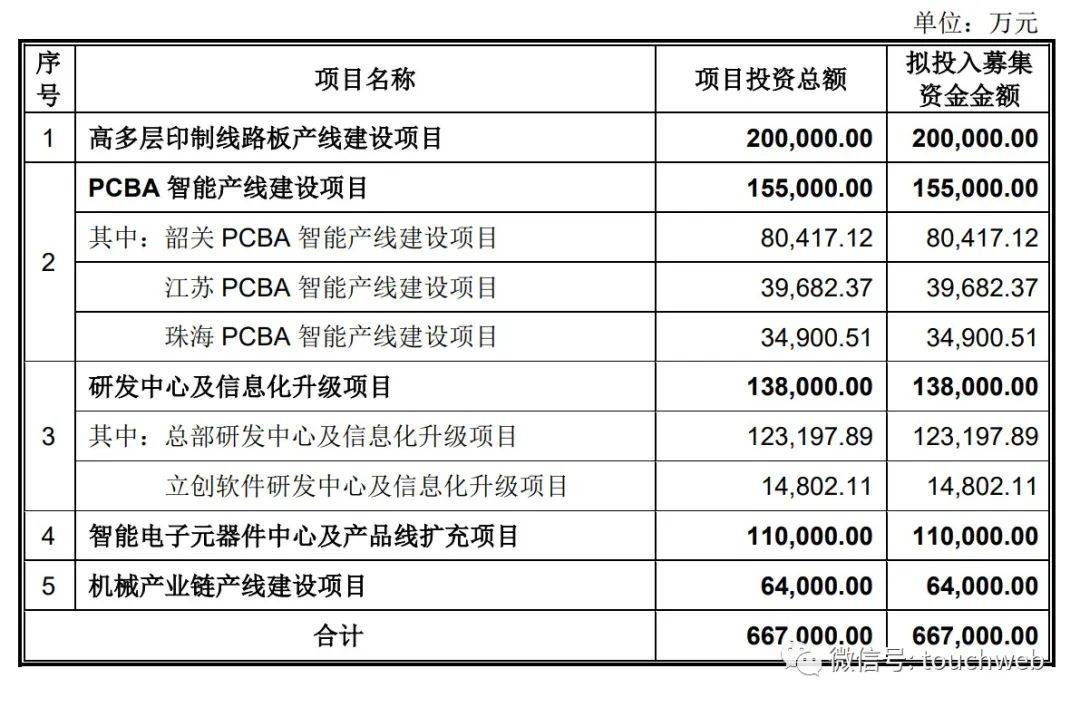 其中,20亿用于高多层印制线路板产线建设项目,15.5亿用于PCBA智能产线建设项目,13.8亿用于研发中心及信息化升级项目,11亿用于智能电子元器件中心及产品线扩充项目,6.4亿用于机械产业链产线建设项目。