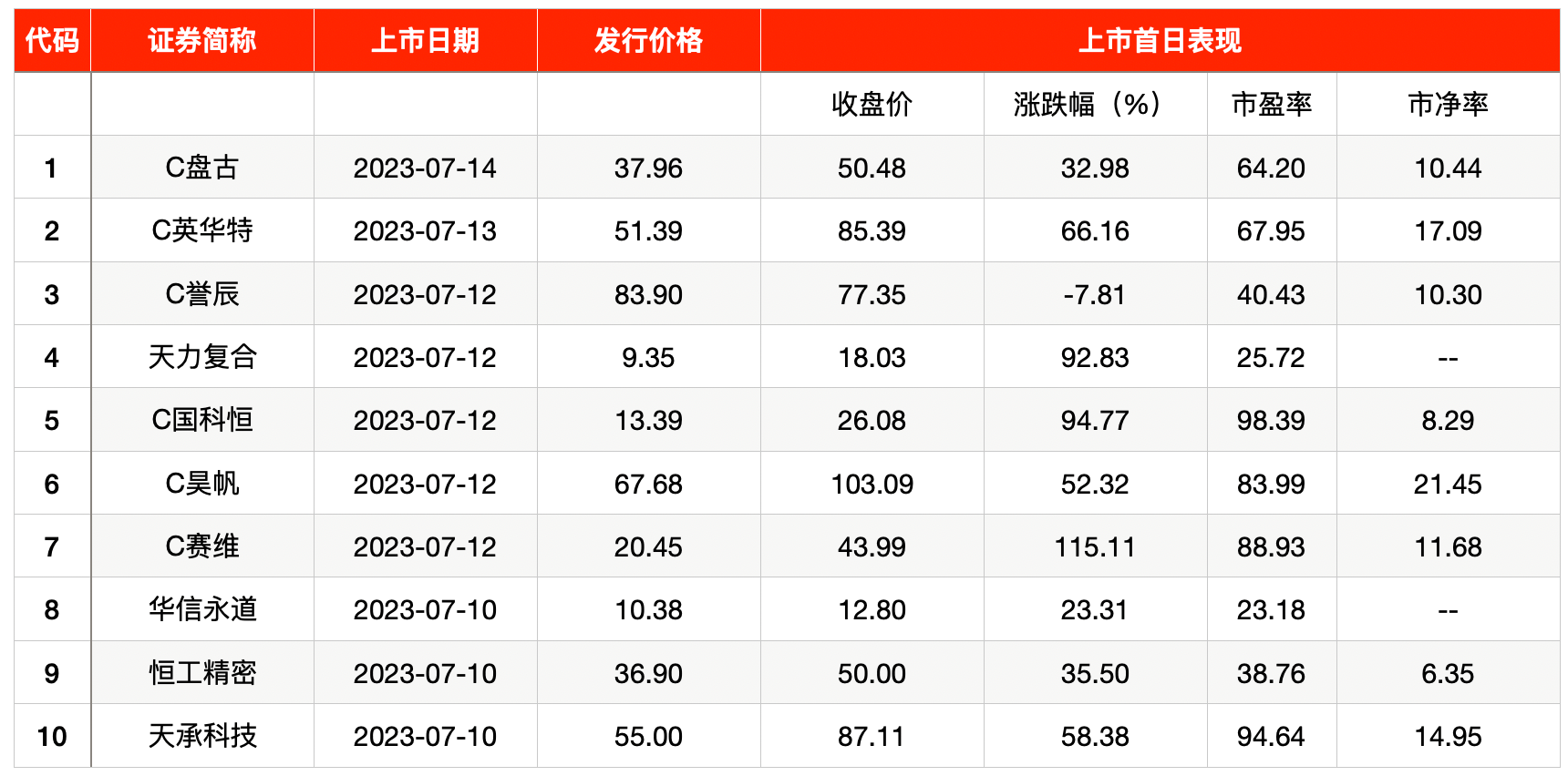 上周共有10只新股上市,仅1股首日收盘破发。赛维时代科技股份有限公司(简称“赛维时代”,301381.SZ)上市首日涨幅高达115.11%;西安天力金属复合材料股份有限公司(简称“天力复合”,873576.BJ)、国科恒泰(北京)医疗科技股份有限公司(简称“国科恒泰”,301370.SZ)首日涨幅也较高,均超过90%。