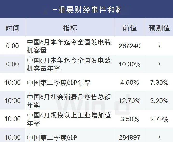 国内方面,市场高度关注将在本周一公布的中国第二季度GDP增速、中国6月社会消费品零售和中国6月规模以上工业增加值等一系列重要经济数据。