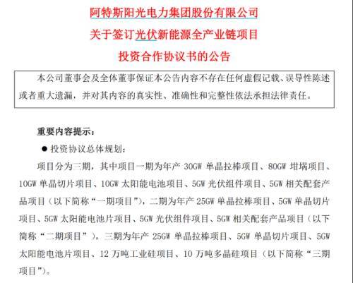 其中,仅仅是一期项目总投资便达到180亿元,固定资产投资约130亿元。而对于二期项目和三期项目,该公司将结合一期项目实施情况和光伏市场需求情况另行协商。