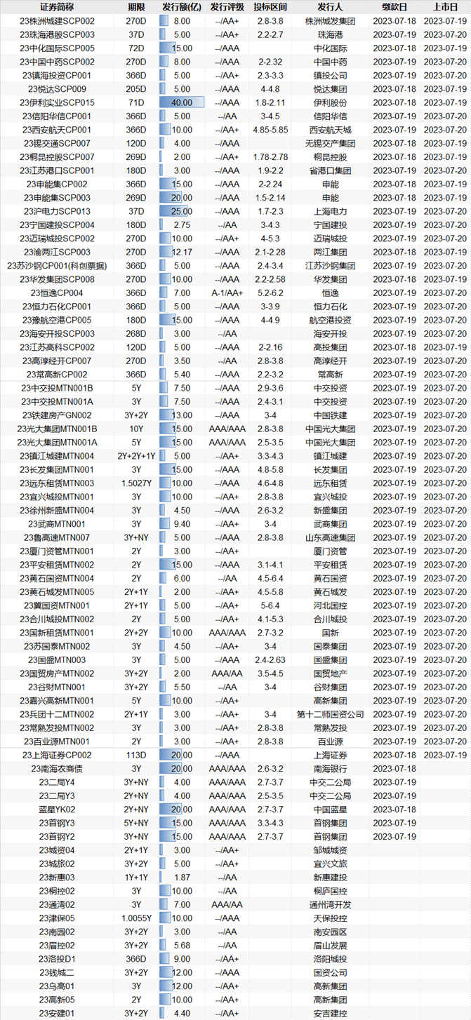 6、截至7月16日,今年共发行48只记账式附息国债,总发行规模为35638.0亿元;共发行40只记账式贴现国债,总发行规模为13487.5亿元。
