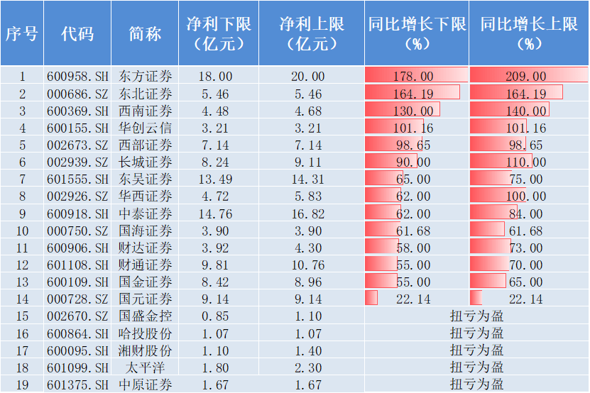 具体来看,截至目前已有8家上市证券公司发布2023年上半年业绩预报或快报,全部实现较大幅度业绩增长。其中东方证券上半年实现归母净利润18-20亿元,同比增加178%-209%,暂居利润涨幅榜首位,东北证券、西南证券同比大增164%、130%分列2、3位,华创云信同比大增超100%,西部证券、长城证券同比增幅均超90%,东吴证券、华西证券、中泰证券、国海证券、财通证券、国金证券同比增幅均在55%以上,国元证券同比增长22%,另外哈投股份、国盛金控、湘财股份、太平洋、中原证券等实现扭亏为盈。