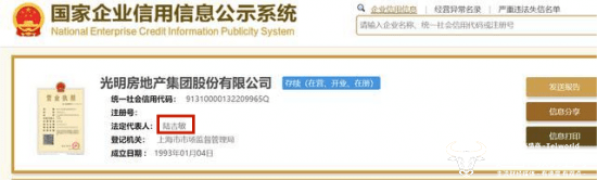 6月19日,工商信息显示,光明地产法人也发生了变更,由“沈宏泽”变更为“陆吉敏”,这么看来光明地产的一把手是彻底换人了。