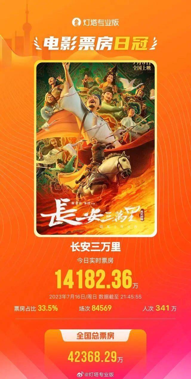 【《长安三万里》上映9天票房登顶日冠】据灯塔专业版,影片《长安三万里》7月16日实时票房达1.42亿,在上映第9天成为票房日冠。(每日经济新闻)