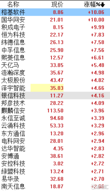 截至发稿,国华网安3连板,榕基软件、积成电子涨停,恒为科技、中孚信息、纬德信息涨超7%,南天信息、电科网安、安博通、绿盟科技等跟涨。