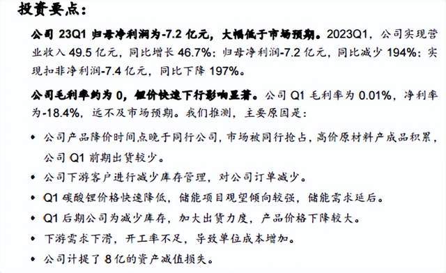 有券商机构分析称,德方纳米的盈利数据不及市场预期的主要原因有六点,包括一季度前期出货较少、公司订单减少、储能需求延后、产品价格下降较大、单位成本增加、计提了 8 亿的资产减值损失等,