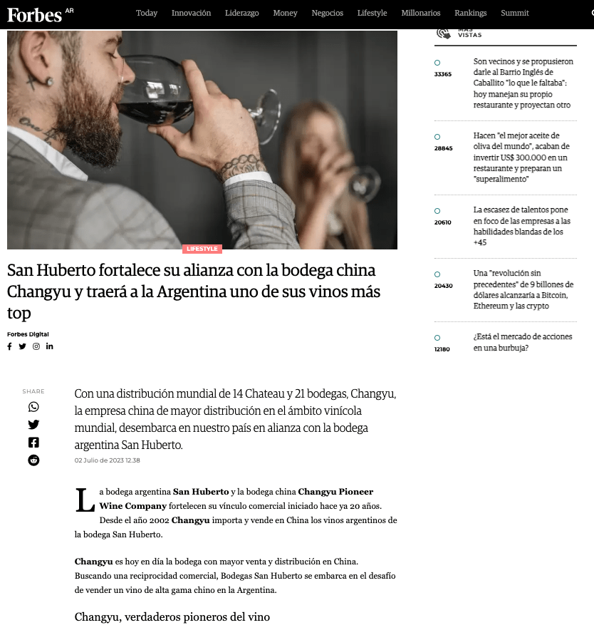 近日,《福布斯》(阿根廷版)发布文章报道龙谕进入阿根廷市场销售。文章提到,“在全球拥有14座酒庄、全球葡萄酒行业布局规模最大的中国企业——张裕,与阿根廷斯帕多内集团合作携顶级葡萄酒登陆阿根廷”。