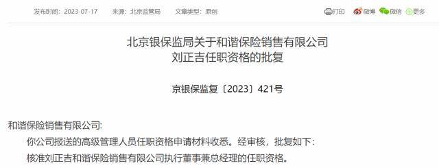 原标题:和谐保险销售总经理刘正吉任职资格获批