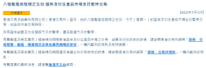 NO.2 香港交易所宣布,由于八号台风信号现正生效,今天(星期一)的证券及衍生产品市场全日暂停交易,包括收市后交易时段。所有证券结算及交收服务今天同时暂停。沪深股通今天也暂停。
