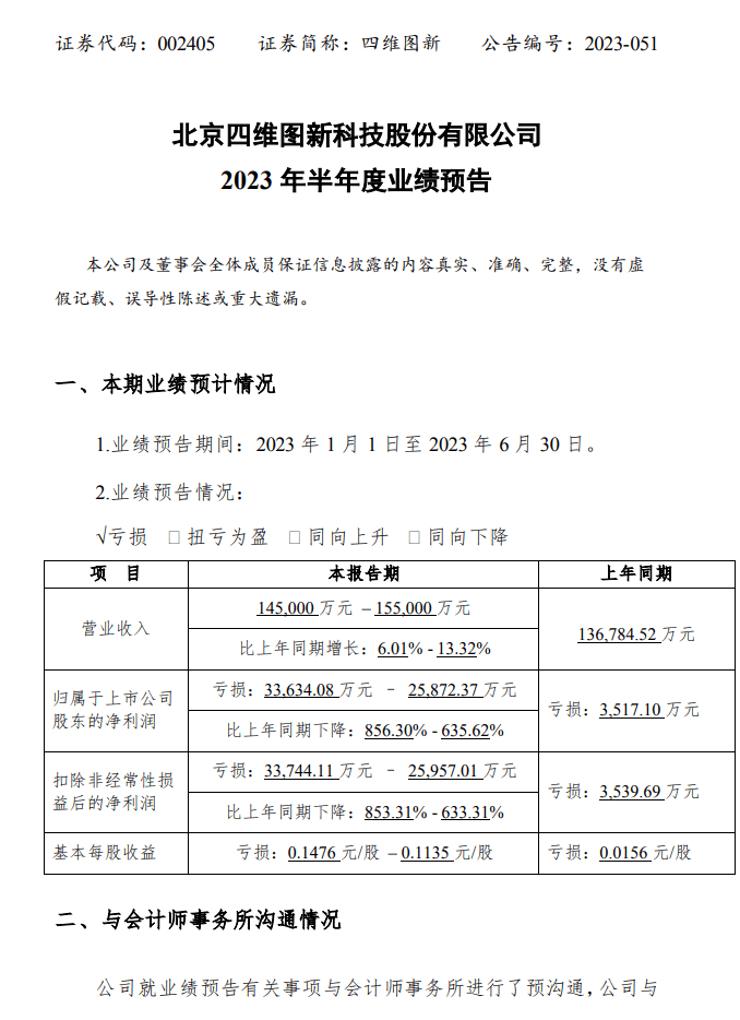 四维图新 2023 年半年度业绩预告显示,该公司预计上半年实现营收 145,000 万元–155,000 万元;预计归属于母公司所有者的净亏损为 33,634.08 万元–25,872.37 万元,同比亏损扩大 856.30%-635.62%。