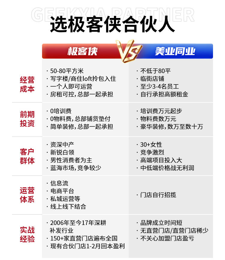 同时,极客侠还有着独特的培训优势,只开放美发师成为门店合伙人,培训合格后正式营业(考核不过关退还加盟费),各区总监360°指导门店运营,实时跟进业务发展。这些优势都为合伙人成功创业提供了巨大的支持和保障。