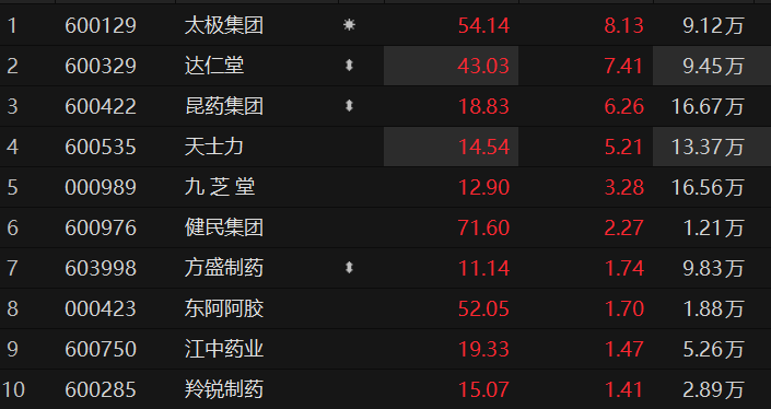 上证报中国证券网讯 7月17日,中药板块震荡回升,截至13:23,太极集团涨超8%,达仁堂、昆药集团、天士力等涨超5%。