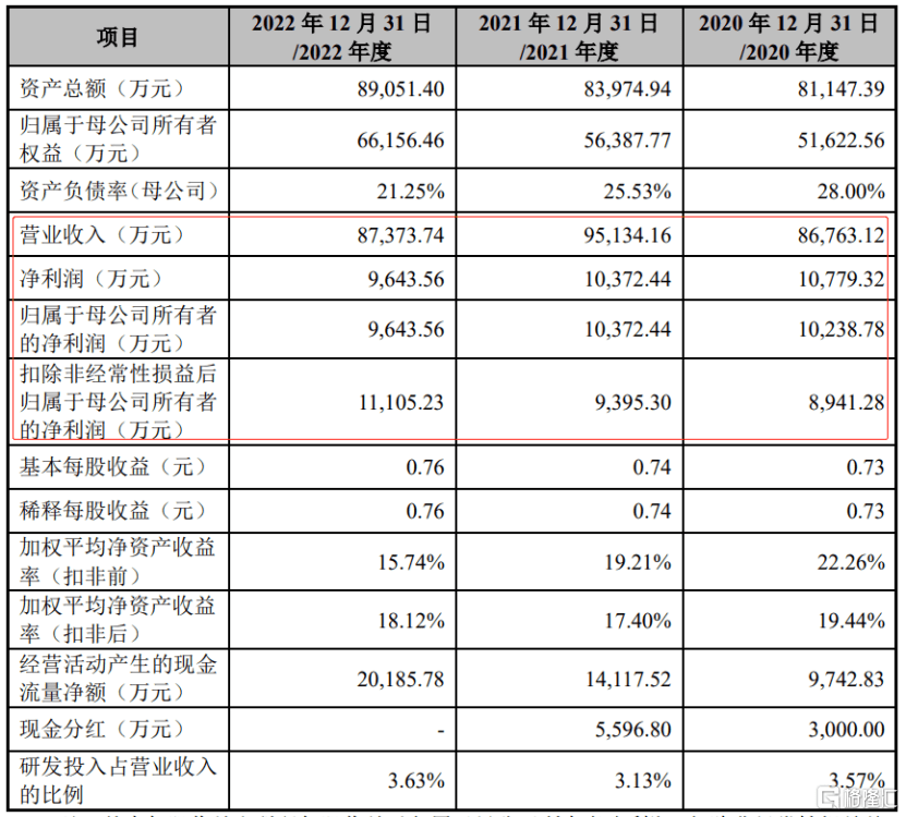 经营业绩方面,信音电子于2020年至2022年的营业收入分别为8.68亿元、9.51亿元、8.74亿元,相对应的扣非后归母净利润分别为8941.28万元、9395.30万元和1.11亿元。其中2020年、2021年,公司分别进行现金分红3000万元、5596.8万元。