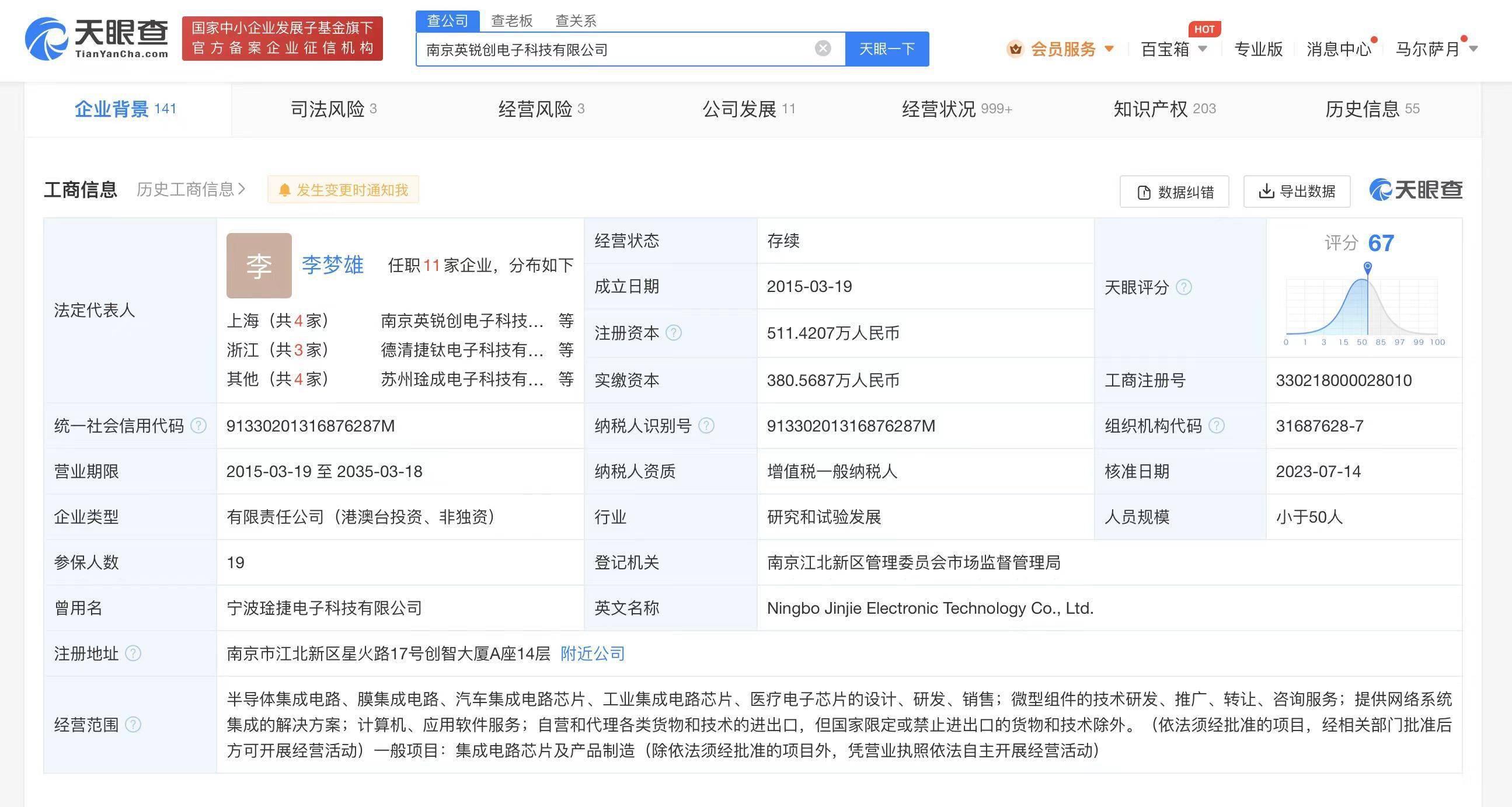 南京英锐创电子科技有限公司成立于2015年3月,法定代表人为李梦雄,经营范围含半导体集成电路、膜集成电路、汽车集成电路芯片、工业集成电路芯片、医疗电子芯片的设计、研发、销售等。